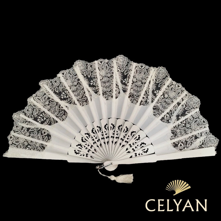 Precioso abanico de ceremonia lacado a dos caras con un precioso calado en su madera, en color blanco novia. Tiene un diseño elegante para novias más clásicas. Su encaje de chantillí le da un toque de elegancia y delicadeza, su encaje dispones de motivos florales lo hace muy especial y delicado.