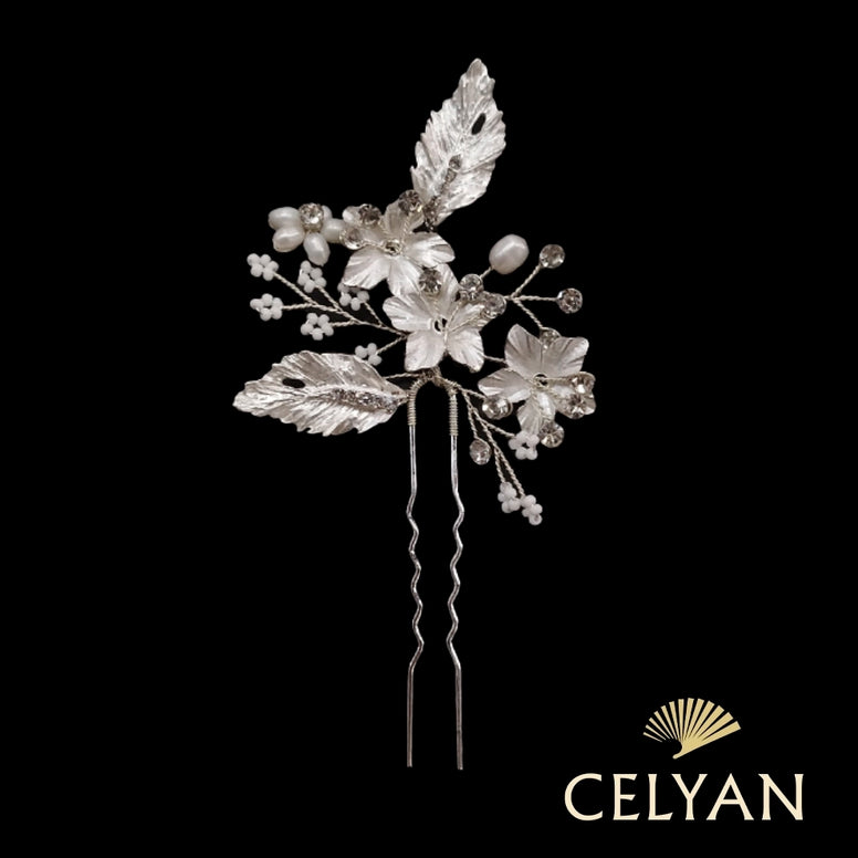 Adorno de pelo en baño rodio en color plata con cristales de alta calidad y pequeña flor en blanco con perlas. Ideales para dar un toque a tu peinado.