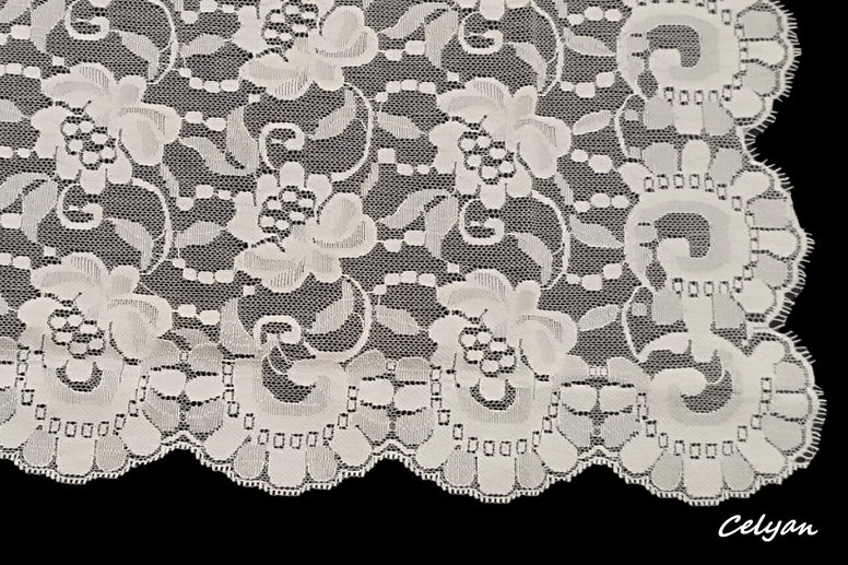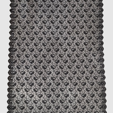 Mantilla española bordada a máquina, en tul con materiales de primera calidad. El estilo de esta mantilla se denomina de blonda, se caracteriza por sus grandes adornos florales. El bordado, va totalmente uniforme con grandes flores, siendo estas mismas las que la rematan, sin efectuar ningún enmarque, lo que da la sensación de amplitud y libertad al movimiento. Se puede lucir tanto para vestir de mantilla en Semana Santa, de madrina de boda o en cualquier evento social de nuestro folklore y también se utiliza como chal.