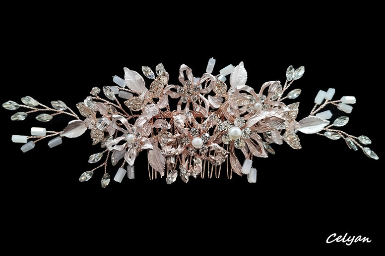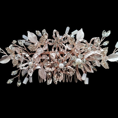 Adorno hecho en cristal con hilo rodiado de color rosa. Una peina  muy versátil y cómodo de llevar, su diseño hace que sea un complemento acertado para cualquier tipo de peinado, ya sea con el pelo suelto o recogido. Su base alambrada hace que se adapte perfectamente a tu peinado. con baño de rodio en color oro rosa con cristales de alta calidad. La pieza es flexible para mejor adaptación al peinado.