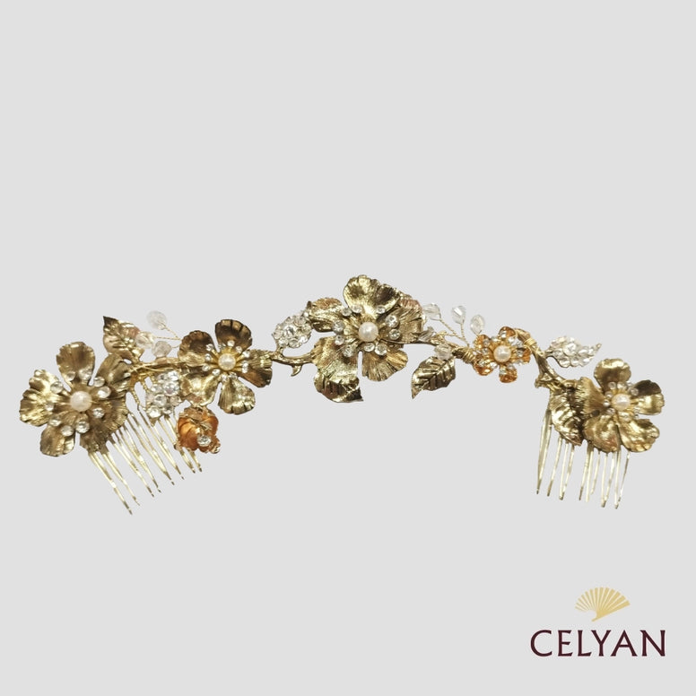 Es una hermosa y elegante peina joya, está elaborado sobre base flexible alambrada que te permite adaptarlo a todo tipo de peinado: recogido, semi-recogido, trenza, coleta, pelo suelto..
