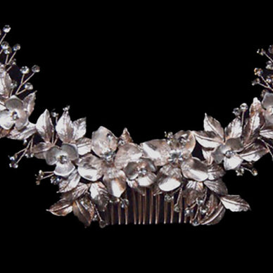 Peineta para novia fabricada con cristales y acabados de metal en color mate rosa de alta calidad. Es un tocado floral con pequeñas flores y hojas. Un tocado para novia, invitada, madrina...muy versátil y cómodo de llevar. Es una hermosa y elegante peina joya, está elaborado sobre base flexible alambrada que te permite adaptarlo a todo tipo de peinado: recogido, semi-recogido, trenza, coleta, pelo suelto..