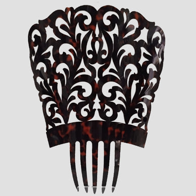 La peina o teja es el principal complemento de la mantilla, cuyo uso se estiló en el siglo pasado con objeto de elevarla para que así ésta favoreciera más al rostro. Peina o teja española para mantilla. Se compone de un cuerpo convexo donde se centra todo su labrado minuciosamente hecho a mano y las púas, que han de encajar en el moño .En forma de U, terminada en picos por la base, y de entramado medio asemejando arboles. El acabado es liso. Es el complemento indispensable para vestir de mantilla en Semana Santa, en bodas, tanto para invitadas como para madrinas y en otros actos típicos de nuestra cultura.