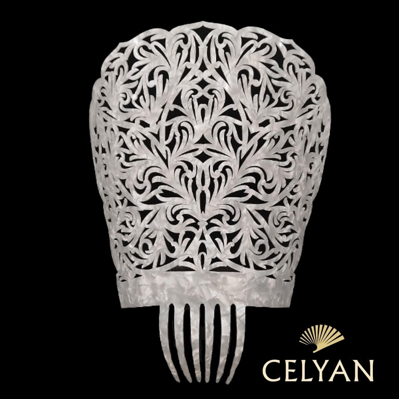 Preciosa peina para mantilla, por su color es ideal para mantillas de color claro para mantener la armonía entre la peina y la mantilla, está realizada en el material acetato. Es muy importante evitar entrar en contacto con perfume o laca y para guardarla siempre utilizar una caja en la que la peina no esté ni muy ajustada ni muy holgada para que no se deforme.