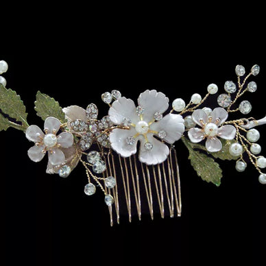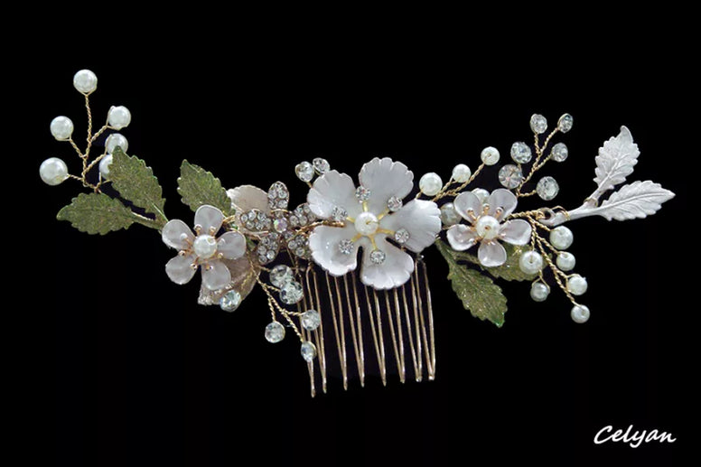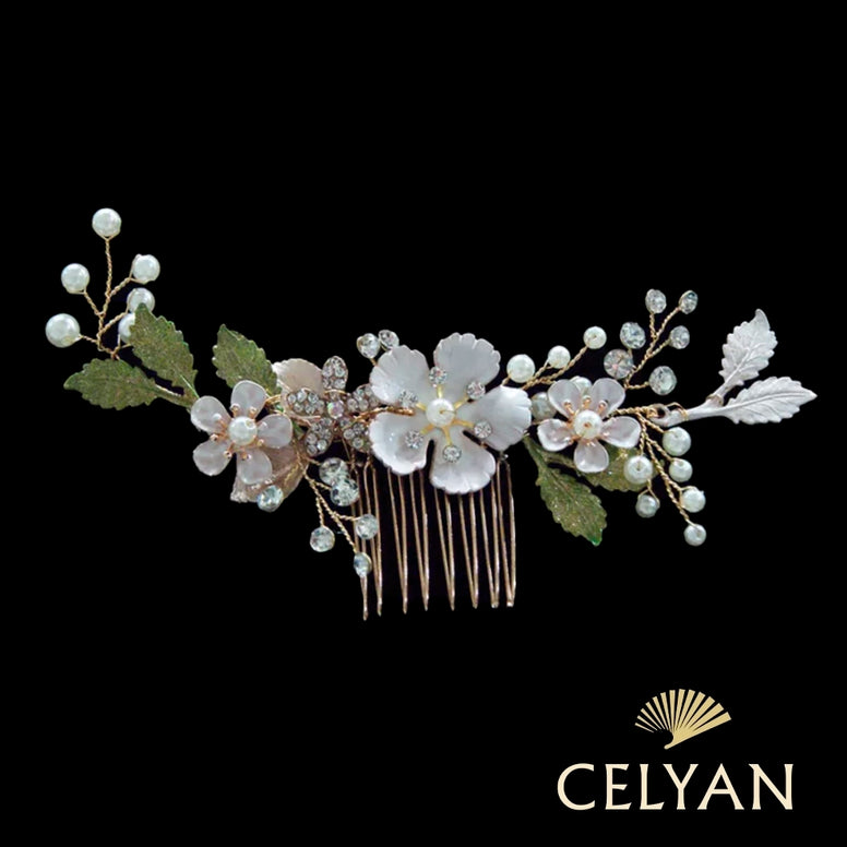Preciosa peina dorada con tonos rosados y hojas de color verde, que dan un toque de elegancia a tu peinado. Cuanta con flores en color rosa nude mate. Está hecha a mano por nuestros artesanos de córdoba, donde cada pieza es única.