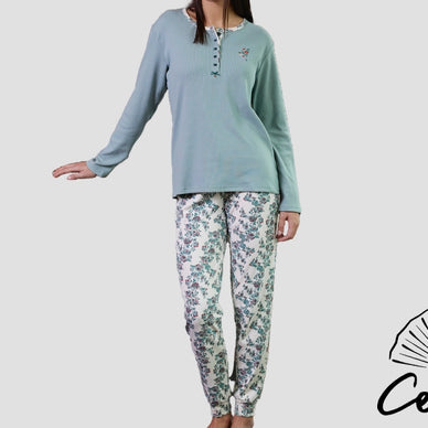 Hermoso pijama floral en tonos verdes y blancos, con un tacto suave y agradable ideal para los días de invierno. Un verdadero lujo para estar en casa sin renunciar al estilo.