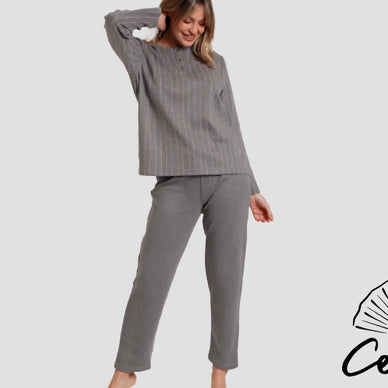 * Pijama de punto de algodón, de manga larga, cuello con tapeta con botones y pantalón largo.