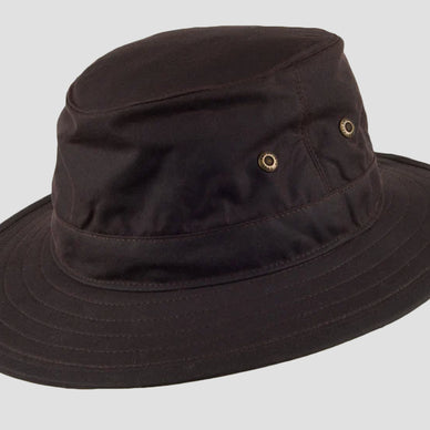 El sombrero de viajero encerado en color marrón de la firma Failsworth. Es el sombrero perfecto para el aire libre. Confeccionado 100 % con algodón encerado británico, mantendrá la cabeza seca durante los días de lluvia. Para una máxima comodidad, el sombrero tiene una banda para el sudor y ojales en el lateral.
