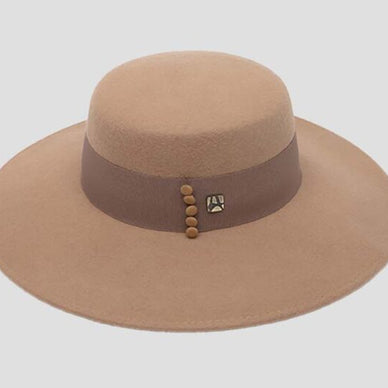 Este sombrero de ala ancha está confeccionado en fieltro de lana en un elegante tono beige, con una banda y detalle de botones a contraste que le dan un toque sofisticado y moderno.