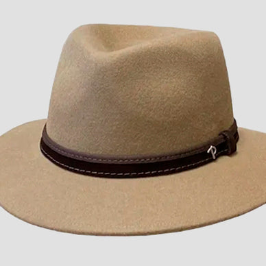 Sombrero tipo indiana (alas bajadas), muy flexible confeccionado en fieltro de lana de primera calidad. Sombrero de ala media y bajada de 6 centímetros, con una copa de 9,5 centímetros.