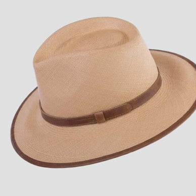 Con una cinta de cuero en la base de la copa y un ribete en el ala de cuero, el sombrero presenta un color beige neutro que lo hace sofisticado y elegante.