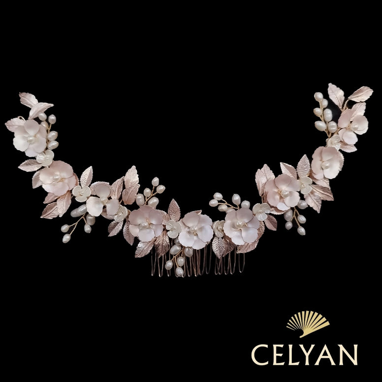Peina para novia fabricada con cristales y acabados de metal en color mate rosa de alta calidad. Es un tocado floral con pequeñas flores y hojas. Un tocado para novia, invitada, madrina…muy versátil y cómodo de llevar. Es una hermosa y elegante peina joya, está elaborado sobre base flexible alambrada que te permite adaptarlo a todo tipo de peinado: recogido, semi-recogido, trenza, coleta, pelo suelto.. Dispone de una peina central para mejor sujeción.