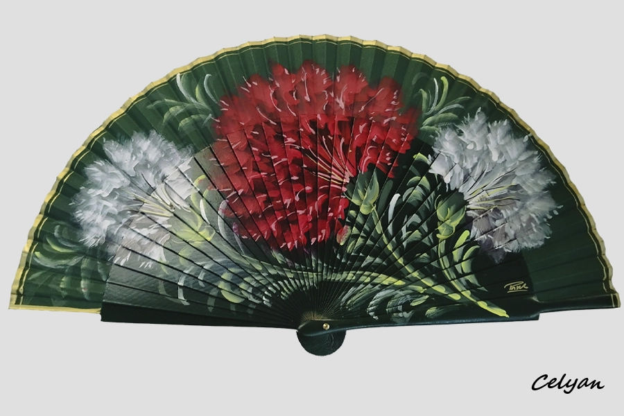 Este abanico esta pintado en color verde botella, en la cara principal cuenta con unos grandes claveles de color rojo y blanco, muy tradicionales en nuestra Andalucía, que ocupan todo el abanico.
