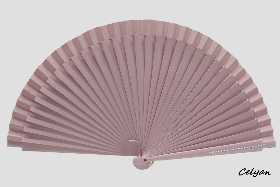 Abanico liso con adorno de pedrería Swarovski en su cabera, ideal para ceremonia, está realizado en madera de abedul en color rosa por ambas caras. Totalmente artesanal.