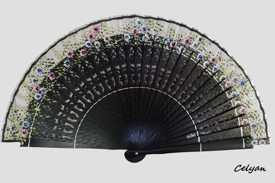 Precioso abanico realizado a mano que te garantiza su elaboración totalmente artesanal. Cuenta con un precioso trabajo en la madera.