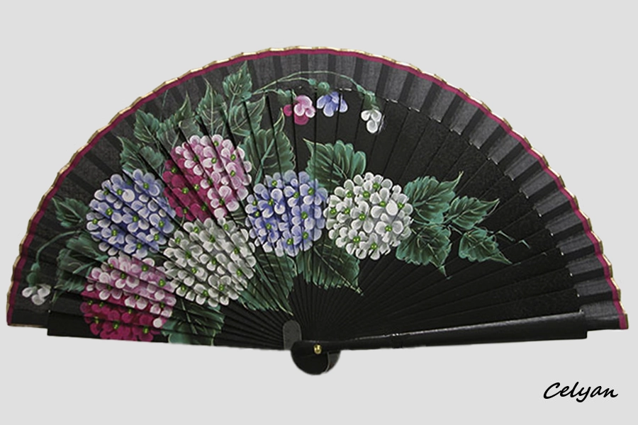 Preciosa pieza artesanal. Este Abanico Hortensias Colores 9432 está realizado por nuestro abaniqueros valencianos, su madera es de abedul en color negro con pintura en flores de hortensias en diferentes colores, dando un toque muy veraniego y elegante.