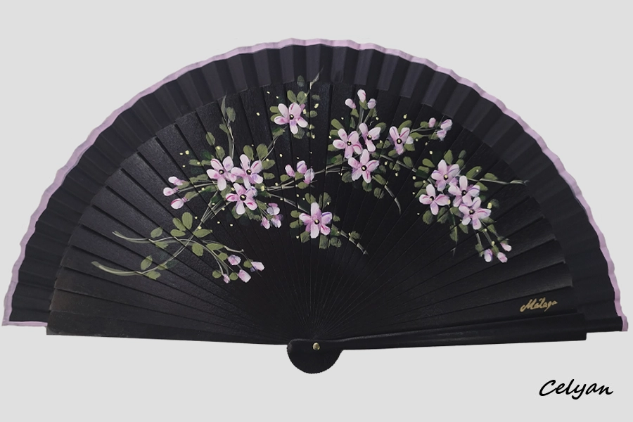 Este precioso abanico pintado a mano con unos jazmines típicos de Málaga, es ligero por el tipo de madera que utiliza (abedul) Está realizado 100% de forma artesanal, fabricado en España. Además es un diseño exclusivo para nuestra tienda Celyan.